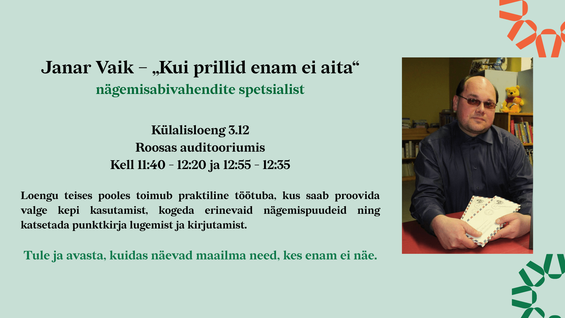 3. detsembril on ülemaailmne puuetega inimeste päev, mil tuleb 20 aastat nägemispuudega inimestega tegelenud Janar Vaik rääkima, mis juhtub siis, kui nägemine nõrgeneb, millised on tänapäevased abivahendid ning kuidas parandada elukvaliteeti ka siis, kui lugemine enam ei õnnestu. Loengu teises pooles toimub praktiline töötuba, kus saab proovida valge kepi kasutamist, kogeda erinevaid nägemispuudeid ning katsetada punktkirja lugemist ja kirjutamist. Tule ja avasta, kuidas näevad maailma need, kes enam ei näe. Külalisloeng toimub G1 ja G2 õpilastele kell 11.40 – 12.20 ja 12.55 – 13.35 Roosas auditooriumis.